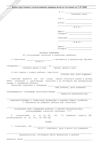 Исковое заявление об установлении отцовства и взыскании алиментов