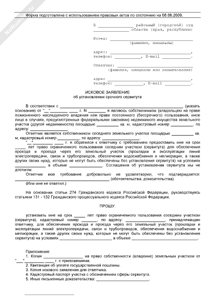 Исковое заявление об установлении ограниченного права пользования земельным участком (сервитута)