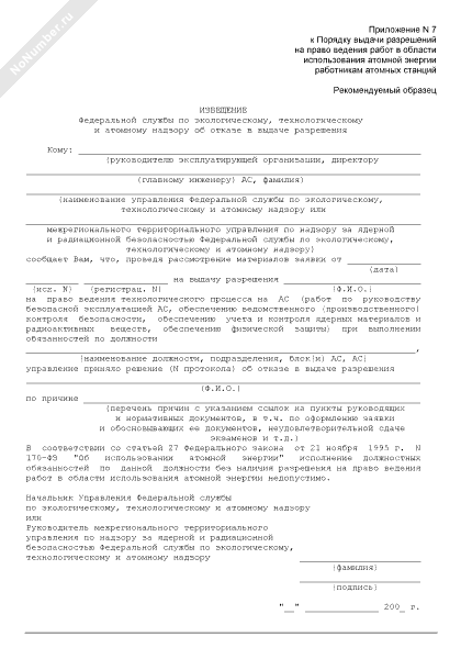 Извещение Федеральной службы по экологическому, технологическому и атомному надзору об отказе в выдаче разрешения на право ведения работ в области использования атомной энергии работникам атомных станций (рекомендуемый образец заполнения)