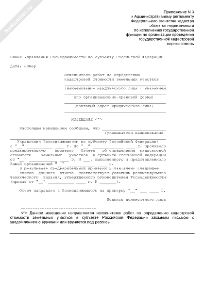 Извещение исполнителю работ по определению кадастровой стоимости земельных участков о направлении отчета об определении кадастровой стоимости земельных участков в субъекте Российской Федерации в Роснедвижимость на проверку (рекомендуемый образец заполнения)