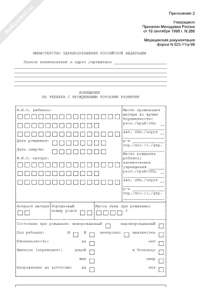 Извещение на ребенка с врожденными пороками развития. Форма № 025-11/У-98 (рекомендуемый образец заполнения)