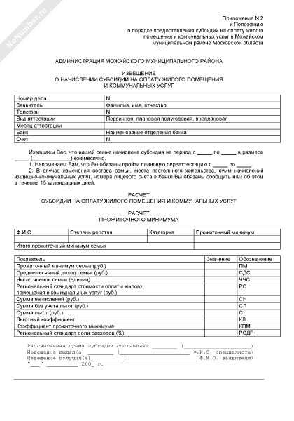 Извещение о начислении субсидии на оплату жилого помещения и коммунальных услуг на территории Можайского муниципального района Московской области (рекомендуемый образец заполнения)