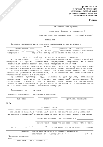 Извещение о направлении копии приговора суда в орган, правомочный аннулировать разрешение на занятие определенным видом деятельности (рекомендуемый образец заполнения)