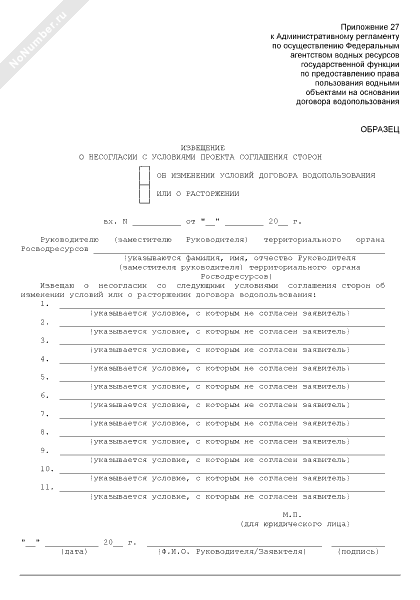 Извещение о несогласии с условиями проекта соглашения сторон об изменении (о расторжении) условий договора водопользования (рекомендуемый образец заполнения)