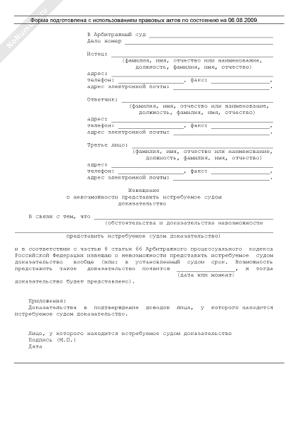 Извещение о невозможности представить истребуемое арбитражным судом доказательство (рекомендуемый образец заполнения)