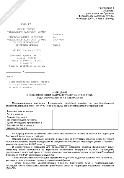 Извещение о невозможности выдачи гражданину справки об отсутствии задолженности по уплате налогов в связи с отсутствием приложенных к заявлению о выдаче справки копий документов, удостоверяющих личность физического лица и подтверждающих последнее место жительства данного физического лица на территории Российской Федерации (рекомендуемый образец заполнения)