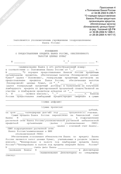 Извещение о предоставлении кредита Банка России
