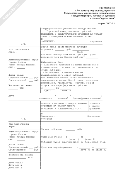 Извещение о предоставлении субсидии на оплату жилого помещения и коммунальных услуг в режиме «Одного окна» города Москвы. Форма № ОЖС-02 (рекомендуемый образец заполнения)