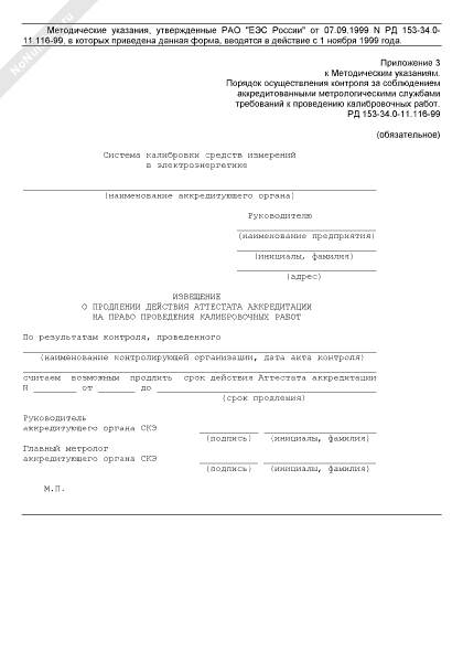 Извещение о продлении действия аттестата аккредитации на право проведения калибровочных работ в электроэнергетике (обязательная форма)