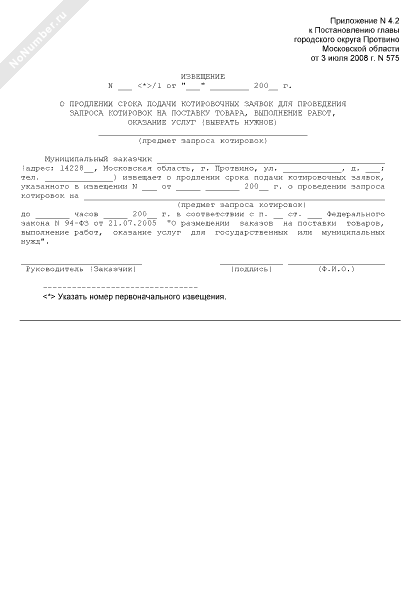 Извещение о продлении срока подачи котировочных заявок для проведения запроса котировок на поставку товара, выполнение работ, оказание услуг в г. Протвино Московской области (рекомендуемый образец заполнения)