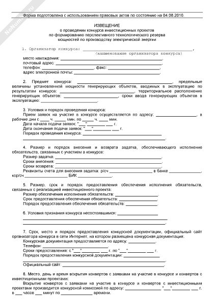 Извещение о проведении конкурса инвестиционных проектов по формированию перспективного технологического резерва мощностей по производству электрической энергии (рекомендуемый образец заполнения)