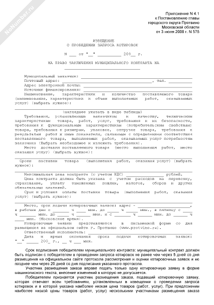 Извещение о проведении запроса котировок на право заключения муниципального контракта в г. Протвино Московской области (рекомендуемый образец заполнения)