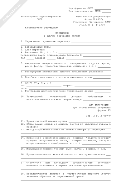 Извещение о случае пересадки органа. Форма № 019/у (рекомендуемый образец заполнения)