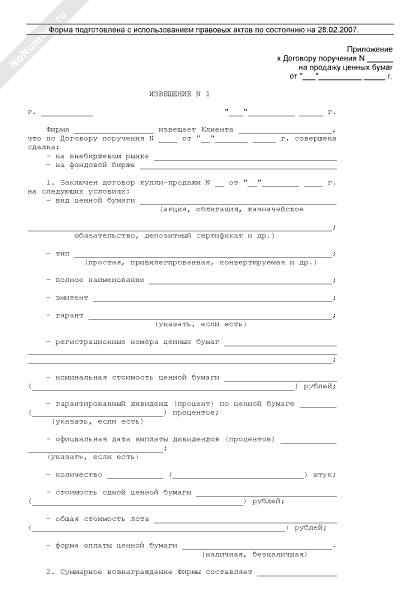 Извещение о совершении сделки по купле-продаже ценных бумаг (приложение к договору поручения на продажу ценных бумаг)