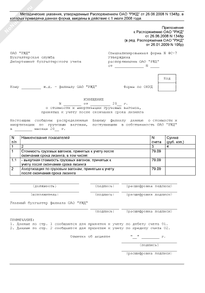 Извещение о стоимости и амортизации грузовых вагонов, принятых к учету после окончания срока лизинга. Специализированная форма № ФС-7 (рекомендуемый образец заполнения)