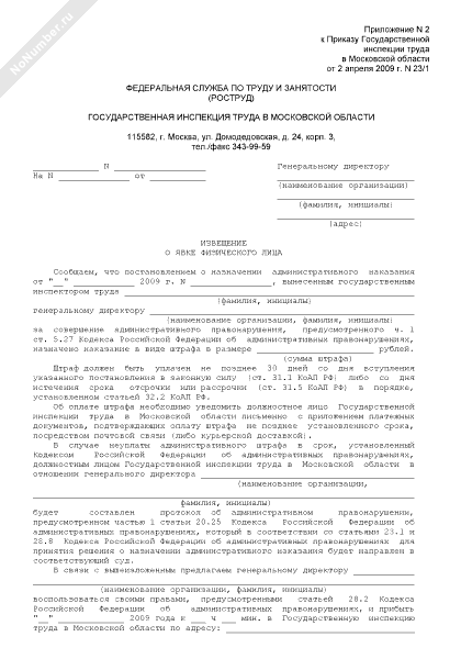 Извещение о явке физического лица в государственную инспекцию труда Московской области (рекомендуемый образец заполнения)