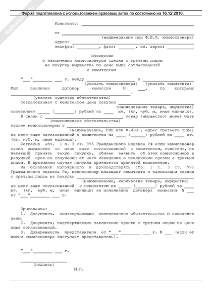 Извещение комитента о заключении комиссионером сделки с третьим лицом на покупку имущества по цене выше согласованной с комитентом (рекомендуемый образец заполнения)
