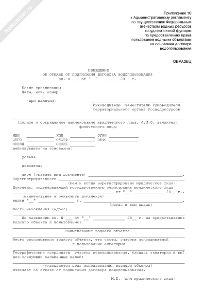 Извещение об отказе от подписания договора водопользования (рекомендуемый образец заполнения)