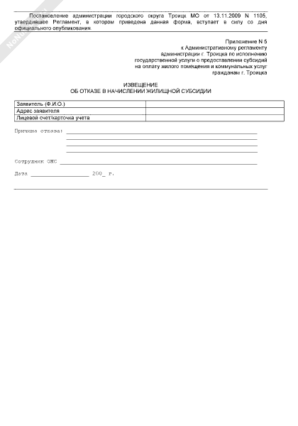 Извещение об отказе в начислении жилищной субсидии жителю г. Троицка Московской области на оплату жилого помещения и коммунальных услуг (рекомендуемый образец заполнения)