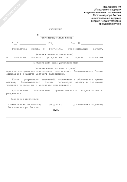 Извещение об отказе в выдаче частного разрешения на право выполнения работ на атомном судне (рекомендуемый образец заполнения)
