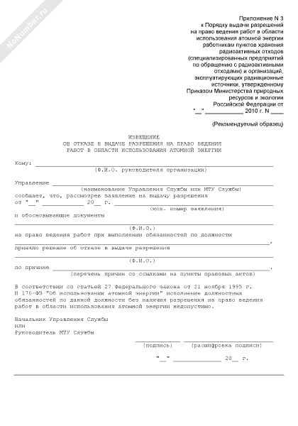 Извещение об отказе в выдаче разрешения на право ведения работ в области использования атомной энергии работникам пунктов хранения радиоактивных отходов (специализированных предприятий по обращению с радиоактивными отходами) и предприятий (учреждений, организаций), эксплуатирующих радиационные источники (рекомендуемый образец заполнения)