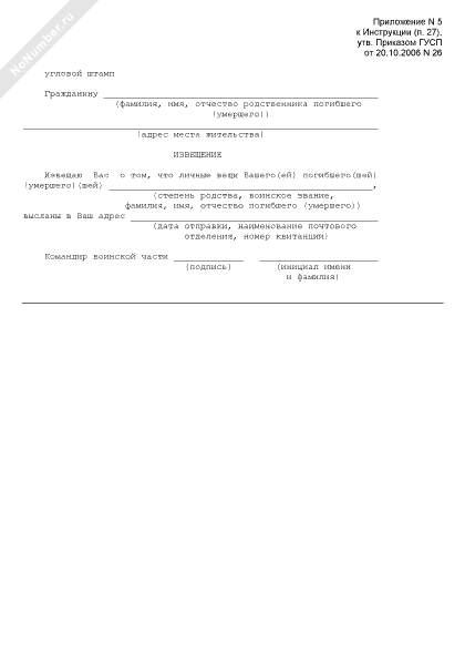 Извещение об отправке личных вещей и ценностей семье или родственникам погибшего (умершего) военнослужащего