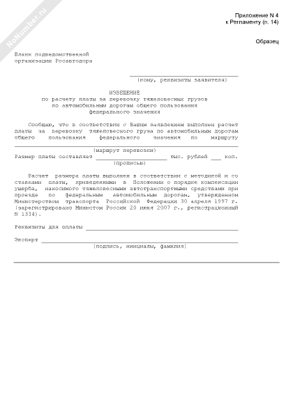 Извещение по расчету платы за перевозку тяжеловесных грузов по автомобильным дорогам общего пользования федерального значения (рекомендуемый образец заполнения)