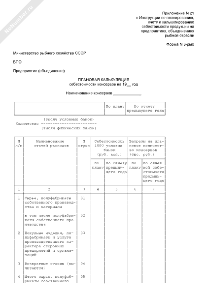 Плановая калькуляция себестоимости консервов. Форма № 3-рыб