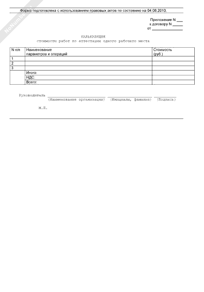 Калькуляция стоимости проведения работ по аттестации рабочих мест по условиям труда (приложение к договору о проведении работ по аттестации рабочих мест по условиям труда)