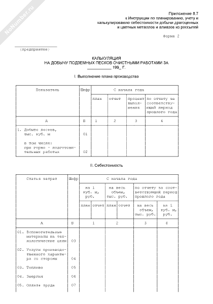 Калькуляция на добычу подземных песков очистными работами (форма № 2)