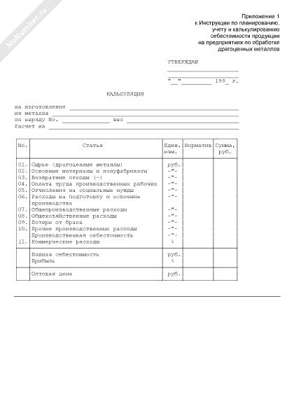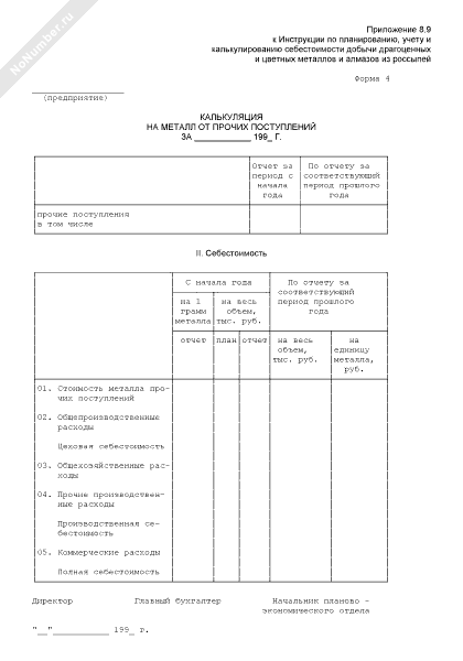 Калькуляция на металл от прочих поступлений (форма № 4)