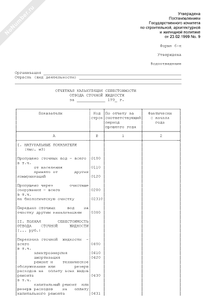 Отчетная калькуляция себестоимости отвода сточной жидкости. Форма № 6-к