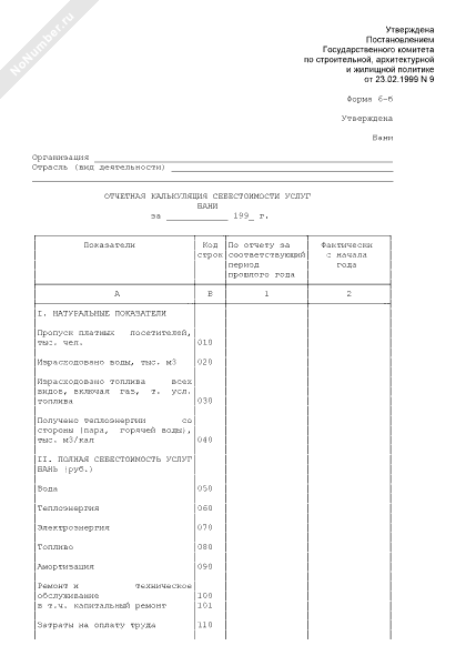 Отчетная калькуляция себестоимости услуг бани. Форма № 6-б