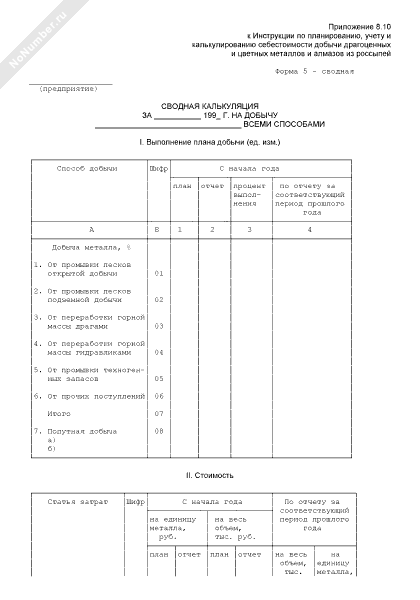 Сводная калькуляция на добычу драгоценных и цветных металлов и алмазов из россыпей всеми способами. Форма № 5 — сводная (рекомендуемый образец заполнения)