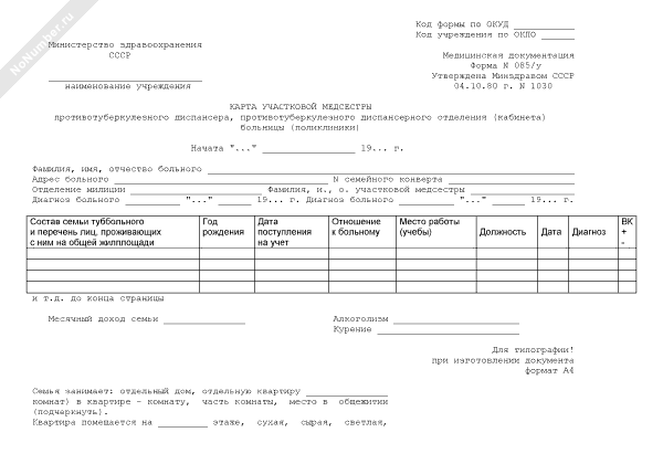 - 183Карта участковой медсестры противотуберкулезного диспансера, противотуберкулезного диспансерного отделения (кабинета) больницы (поликлиники). Форма № 085/у