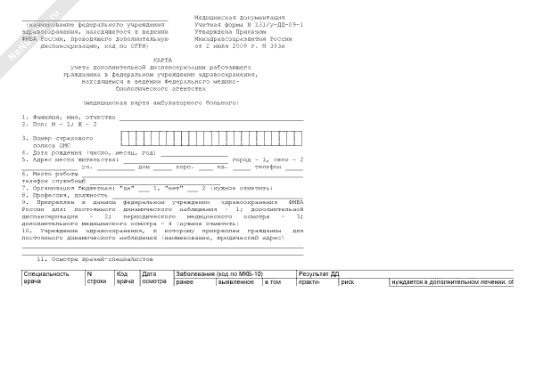 - 199Карта учета дополнительной диспансеризации работающего гражданина в федеральном учреждении здравоохранения, находящемся в ведении Федерального медико-биологического агентства. Учетная форма № 131/у-ДД-10-1