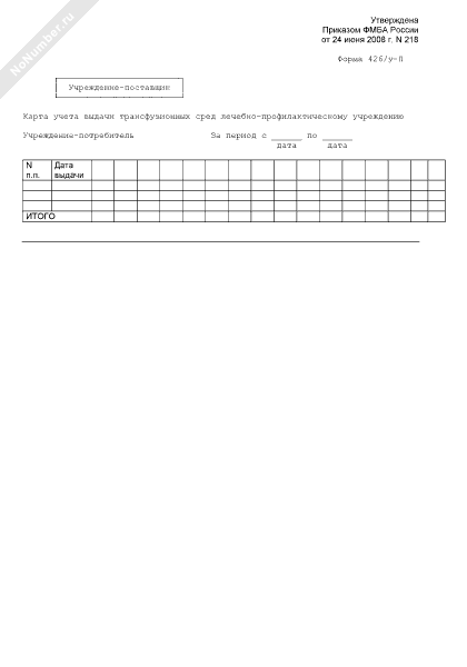 - 187Карта учета выдачи трансфузионных сред лечебно-профилактическому учреждению. Форма № 426/у-П