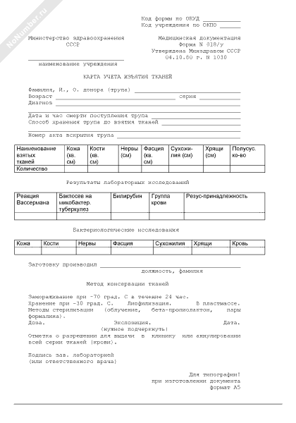 - 203Карта учета изъятия тканей. Форма № 018/у