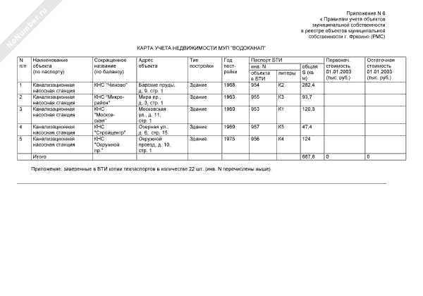 - 207Карта учета недвижимости МУП «Водоканал» для регистрации в реестре объектов муниципальной собственности г. Фрязино Московской области