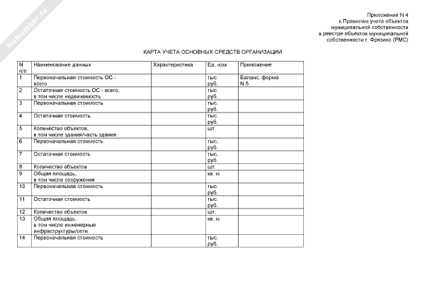 - 219Карта учета основных средств организации для регистрации в реестре объектов муниципальной собственности г. Фрязино Московской области