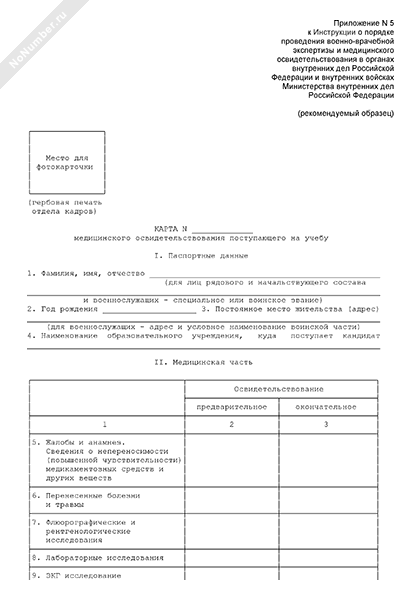 Карта медицинского освидетельствования поступающего на учебу в образовательное или военно-образовательное учреждение Министерства внутренних дел Российской Федерации