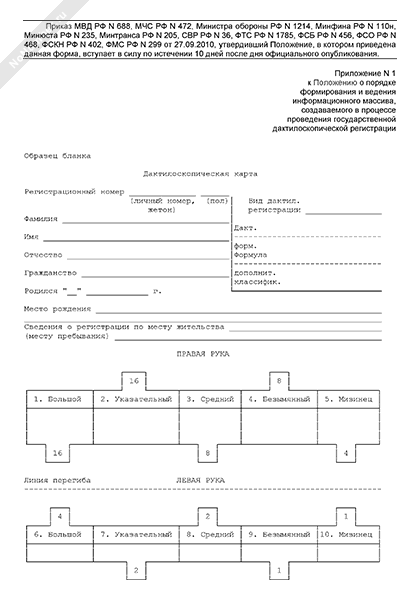 Дактилоскопическая карта, предназначенная для добровольной государственной дактилоскопической регистрации лиц (рекомендуемый образец заполнения)