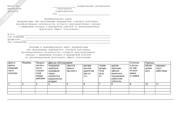 Индивидуальная карта предрейсовых или предсменных медицинских осмотров работника, производственная деятельность которого непосредственно связана с движением поездов и маневровой работой на железнодорожном транспорте общего пользования (рекомендуемый образец заполнения)