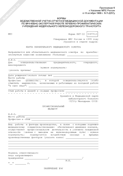 Карта обязательного медицинского осмотра сотрудника учреждений федерального железнодорожного транспорта. Форма № АКУ-22 (рекомендуемый образец заполнения)