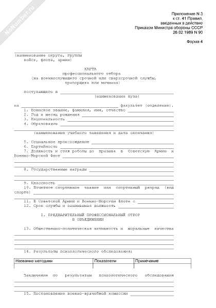 Карта профессионального отбора (на военнослужащего срочной или сверхсрочной службы, прапорщика или мичмана), поступающего в военно-учебное заведение Министерства обороны СССР (форма № 4)