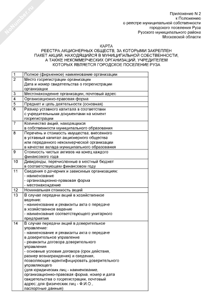 Карта реестра акционерных обществ, за которыми закреплен пакет акций, находящийся в муниципальной собственности, а также некоммерческих организаций, учредителем которых является городское поселение Руза Московской области (рекомендуемый образец заполнения)