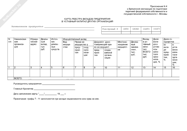 Карта реестра вкладов учредителей в уставный капитал предприятия