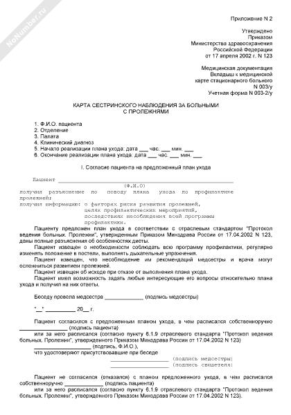 Карта сестринского наблюдения за больными с пролежнями. Учетная форма № 003-2/У (рекомендуемый образец заполнения)