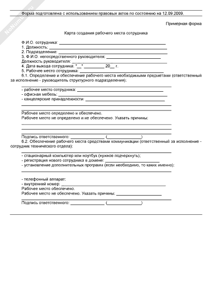Карта создания рабочего места сотрудника (рекомендуемый образец заполнения)