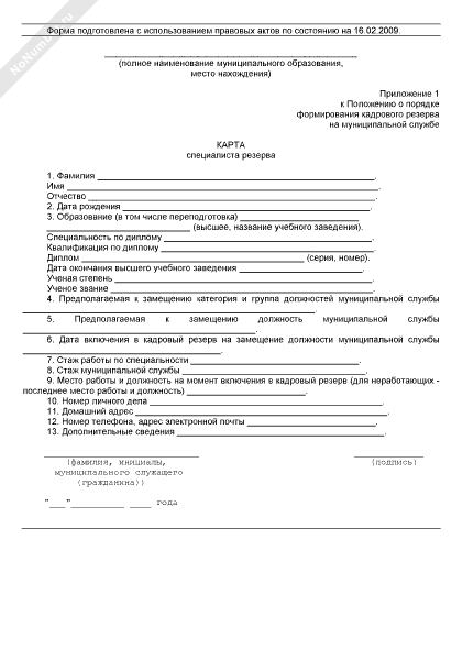 Карта специалиста резерва (приложение к положению о порядке формирования кадрового резерва на муниципальной службе)